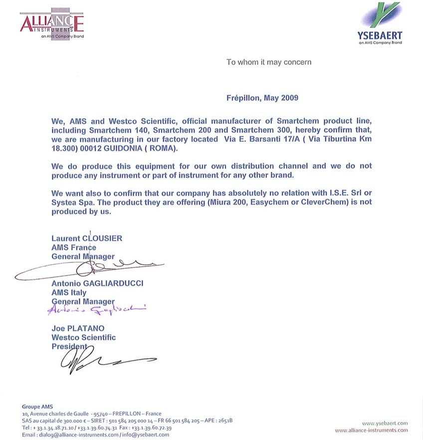 针对目前中国国内市场某些公司在宣传产品上借用AMS集团旗下公司名义,向客户推介仪器时介绍产品为AMS公司代工或者贴牌或者AMS公司提供零部件,误导客户,混淆视听。意大利AMS集团特向广大用户和公司声明:集团作为Smartchem140、Smartchem200、Smartchem300的生产厂家从来没有向其它品牌生产仪器或者提供零部件。AMS集团与I.S.E 公司和Systea公司没有任何关系,Miura200、Easychem、CleverChem等分析仪不是AMS集团生产的。厂家声明如下