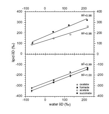 此前文献表明绝大多数生物中脂肪与水分之间存在比较大的D/H的分馏。这种分馏归结为同位素对脂肪生物合成的影响。本文我们报导了4种细菌(phylum Proteobacteria)的脂肪与水分之间的D/H分馏 ,结果表明单一生物之中波动可以达到500‰ 。这种变动不可能归因于脂肪生物合成,因为这些途径中没有明显的变化,也不能归因于培养基的D/H比率。更重要的是,脂肪/水的D/H随着新陈代谢而系统地变化:化学自养生长(几乎达到-200到-400‰)、光合自养生长的(-150到-250‰)、非自养生物,采用糖做培养基的生物(0到-150‰),以及非自养生物,采用TCA循环(-50到-200‰) 。我们猜测脂肪的D/H比率很大程度上是由生物合成的NADPH来控制,而不是脂肪生物合成途径本身来决定的。我们的结果表明,不同的代谢途径产生NADPH—并间接影响脂肪的同位素组成。如果是这样,脂肪的δD值可能成为连接脂肪和能量代谢的重要生物化学循环工具,并可通过固碳途径中13C提供了更多的补充信息。